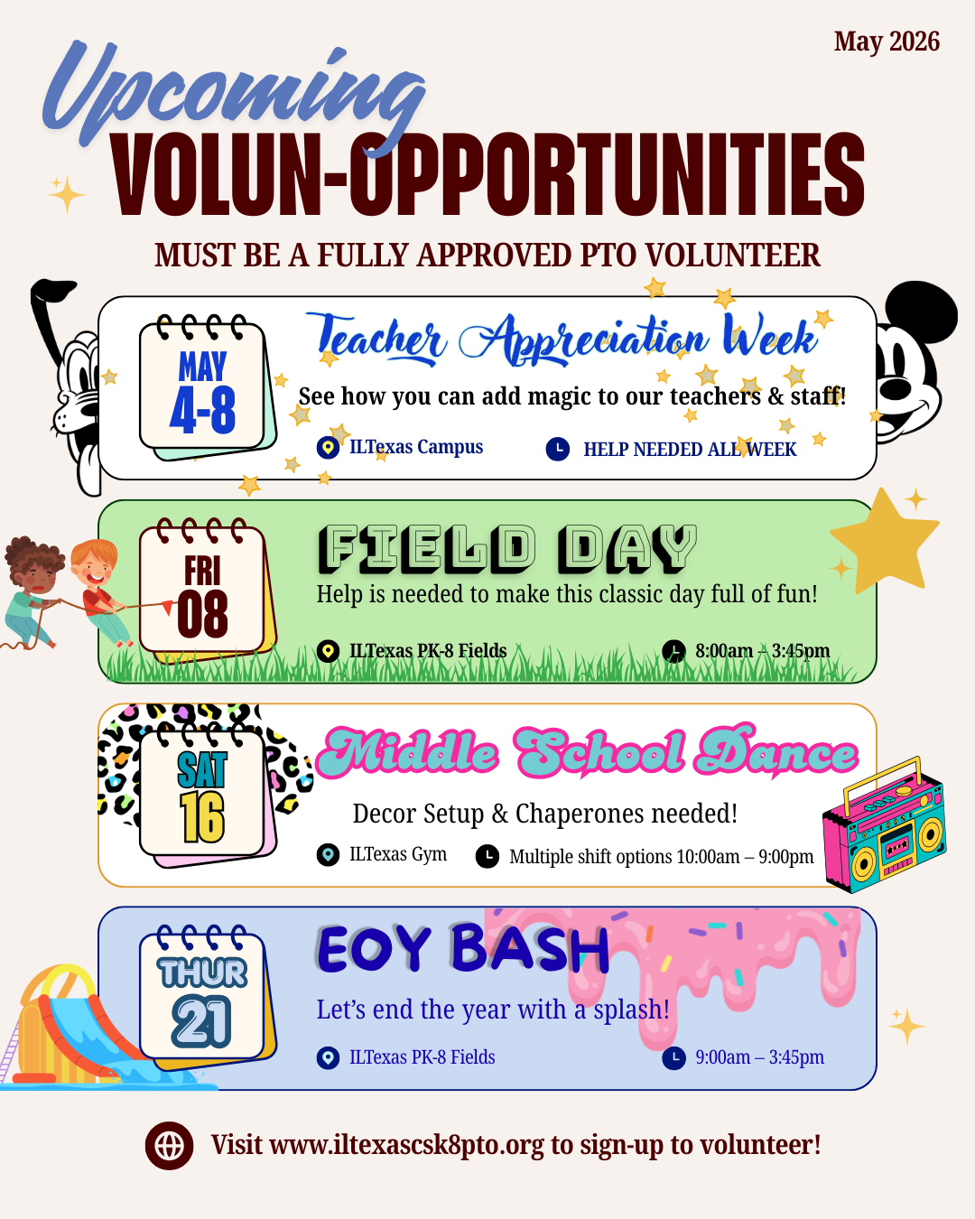 Help make the end of the school year unforgettable. Must be a fully approved PTO volunteer member to attend all events (End of Year Bash excluded).
